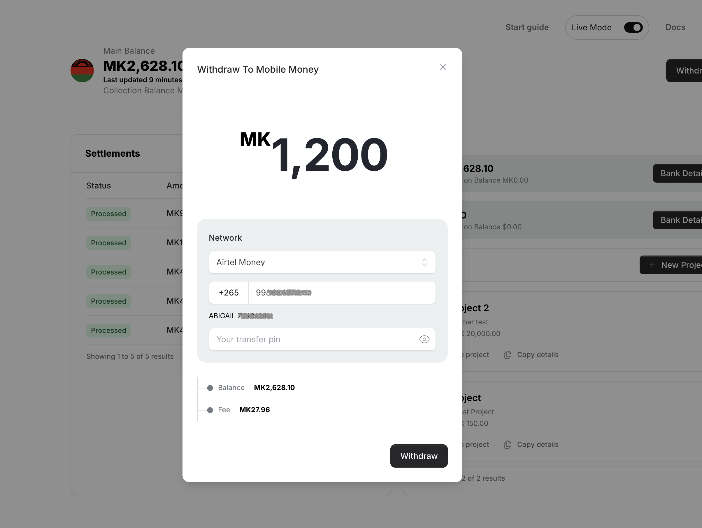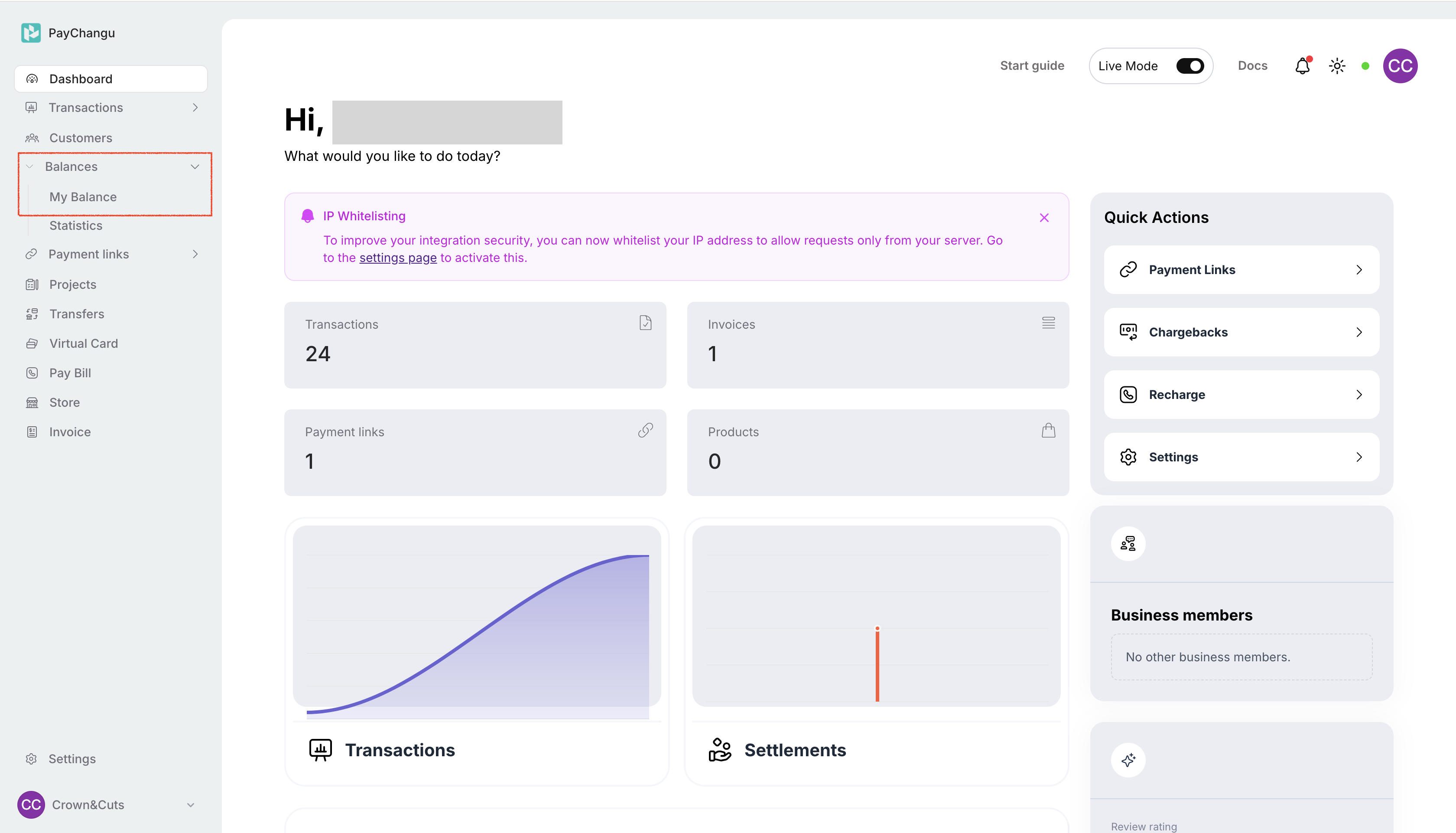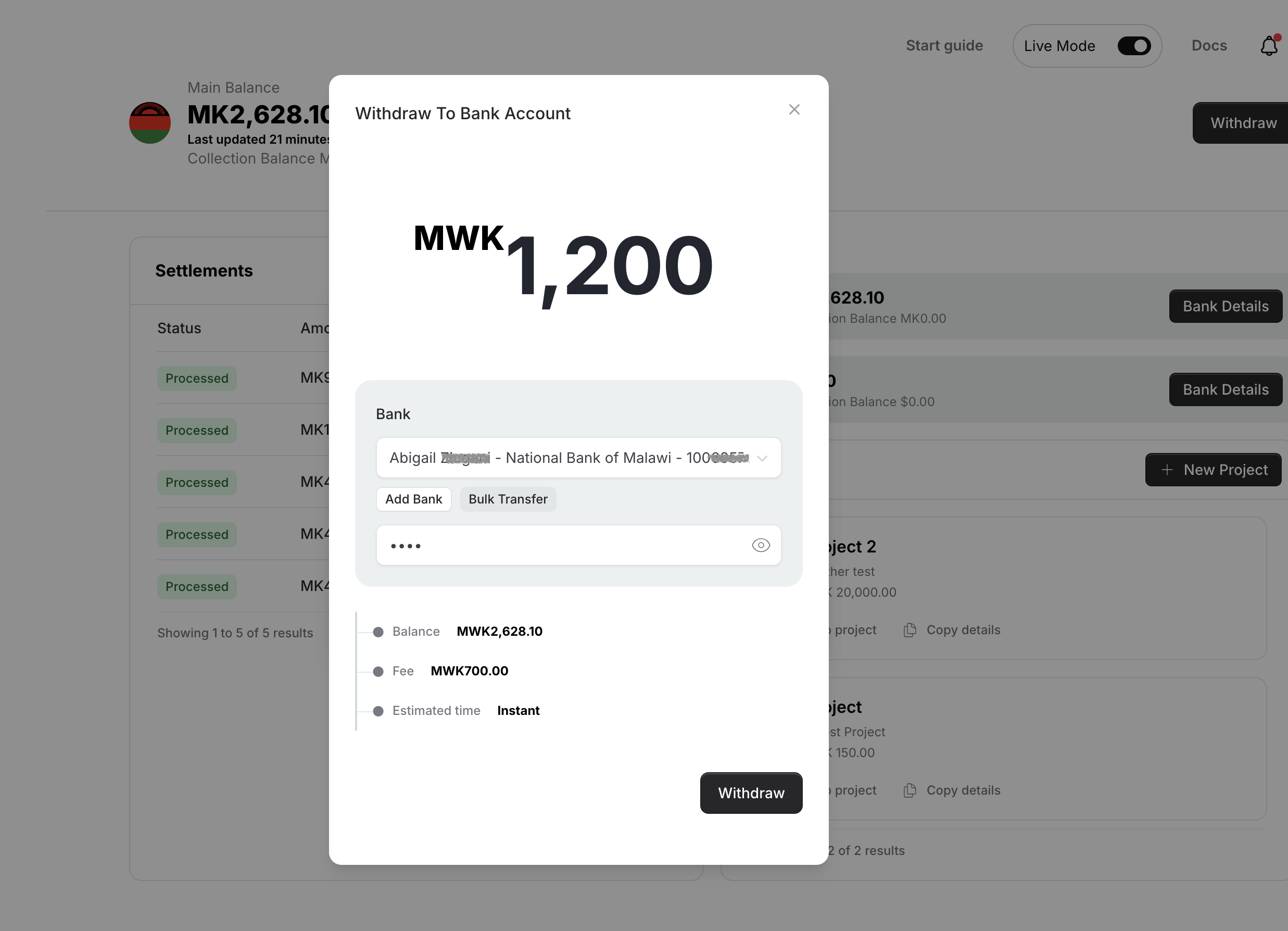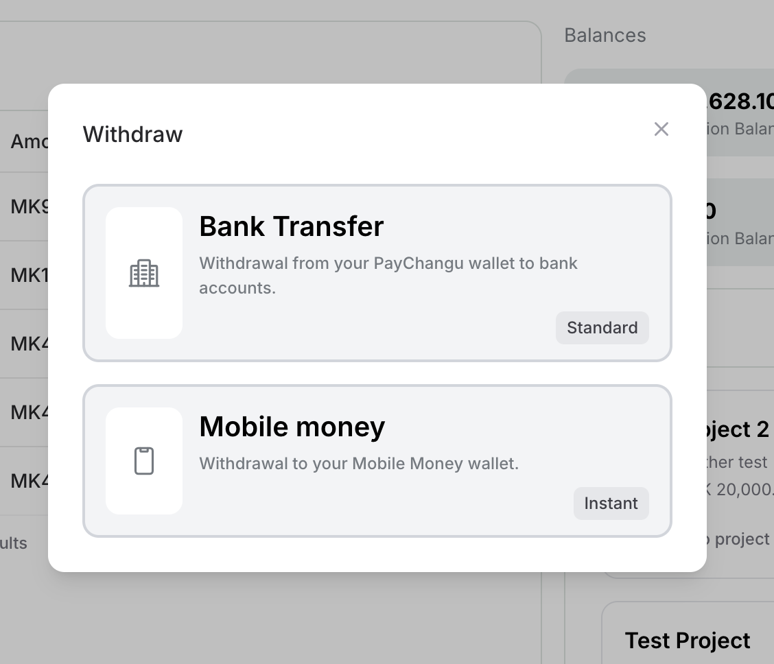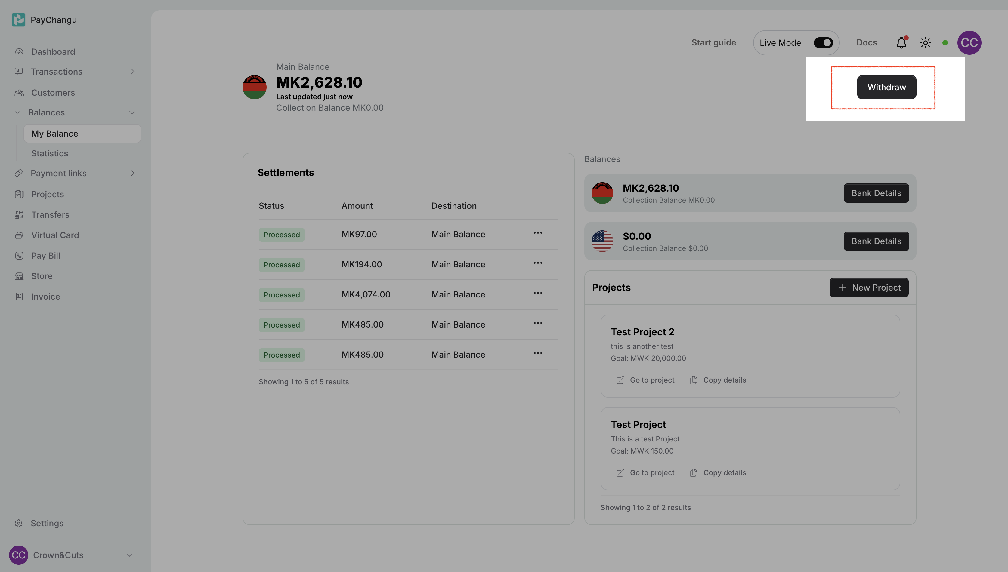 To withdraw funds from PayChangu, they must first be available in your Main Balance.