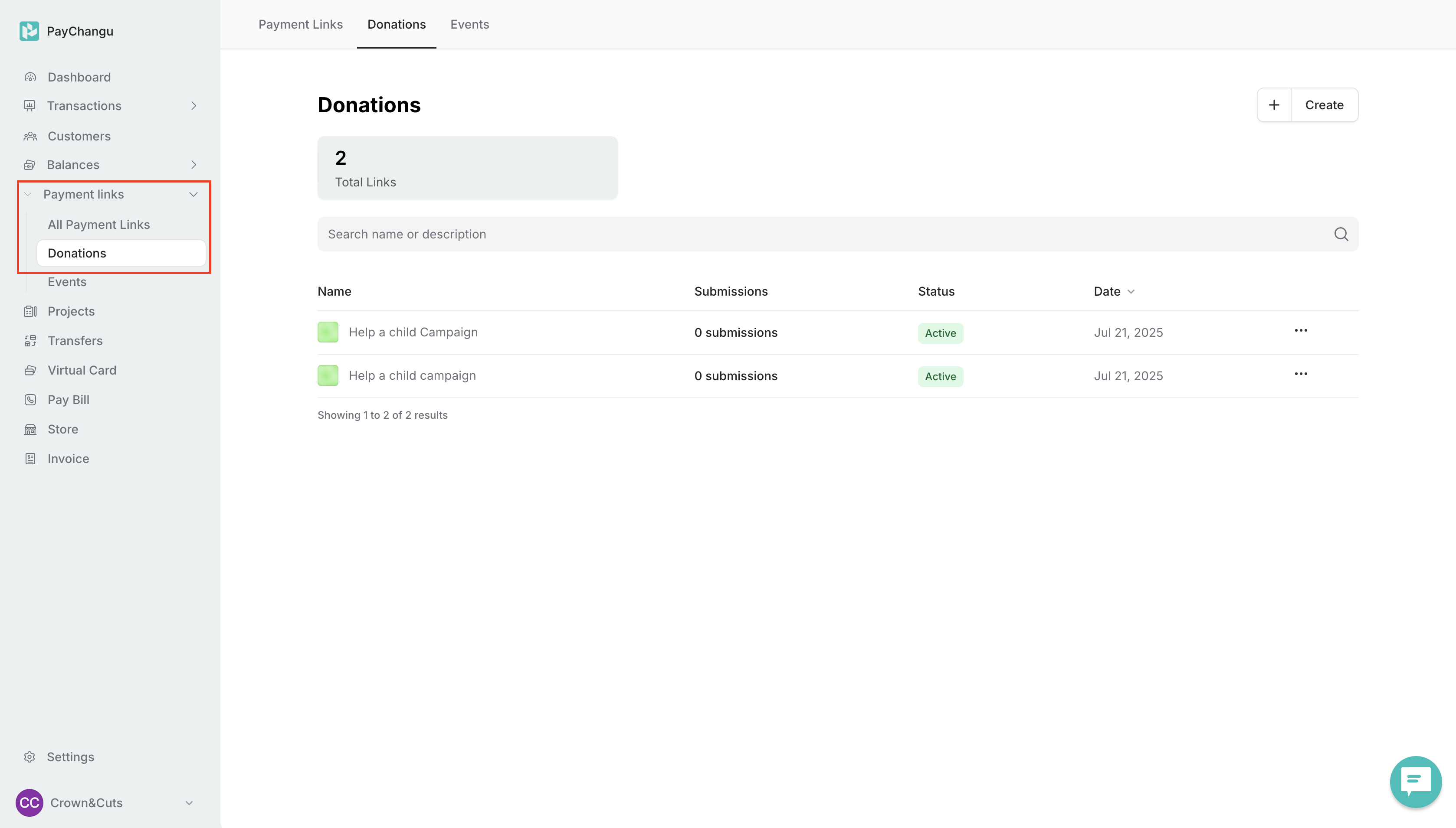 Click Create or the plus (+) icon to start a new donation link.