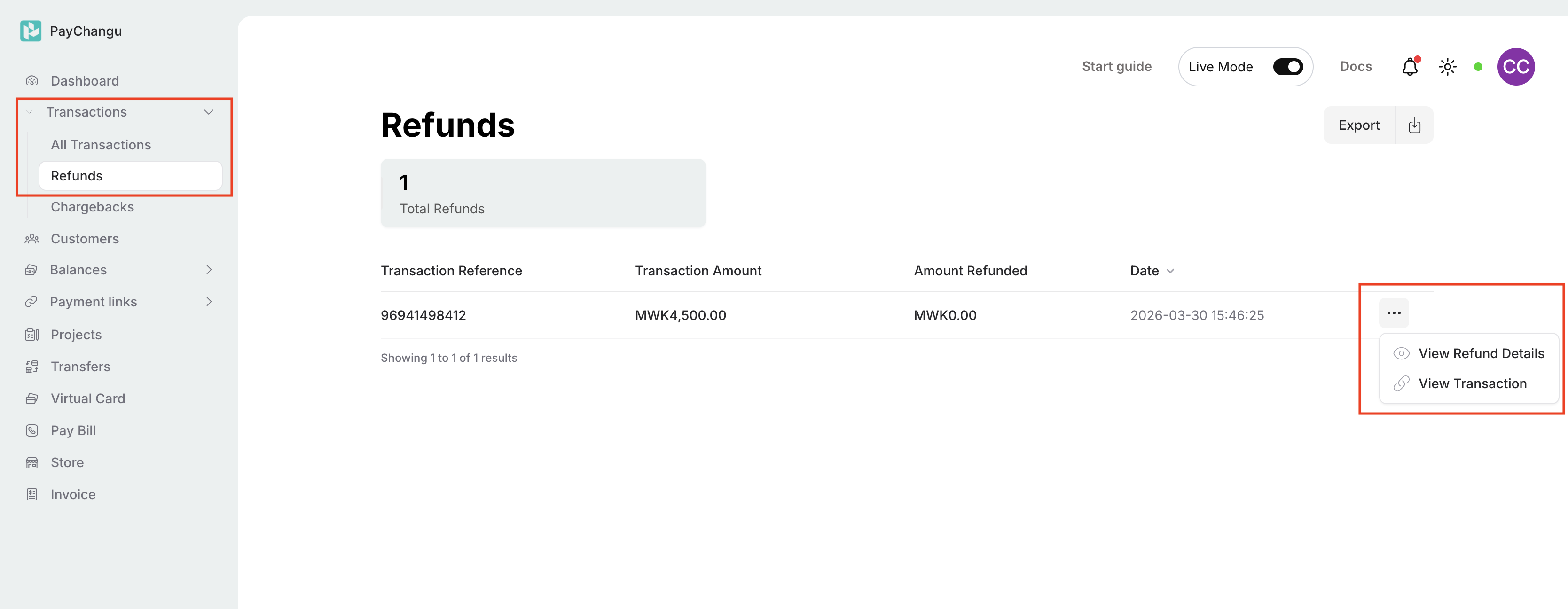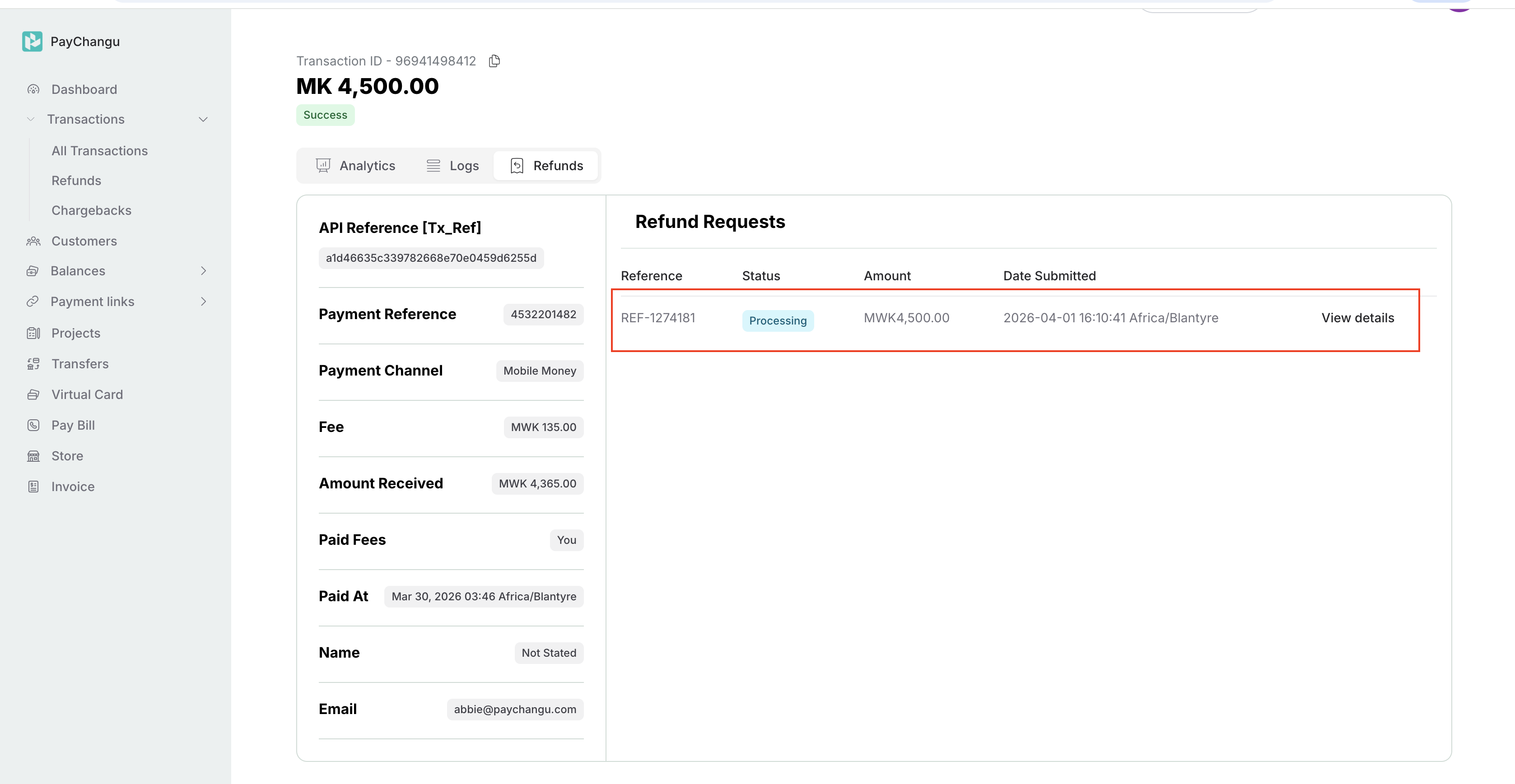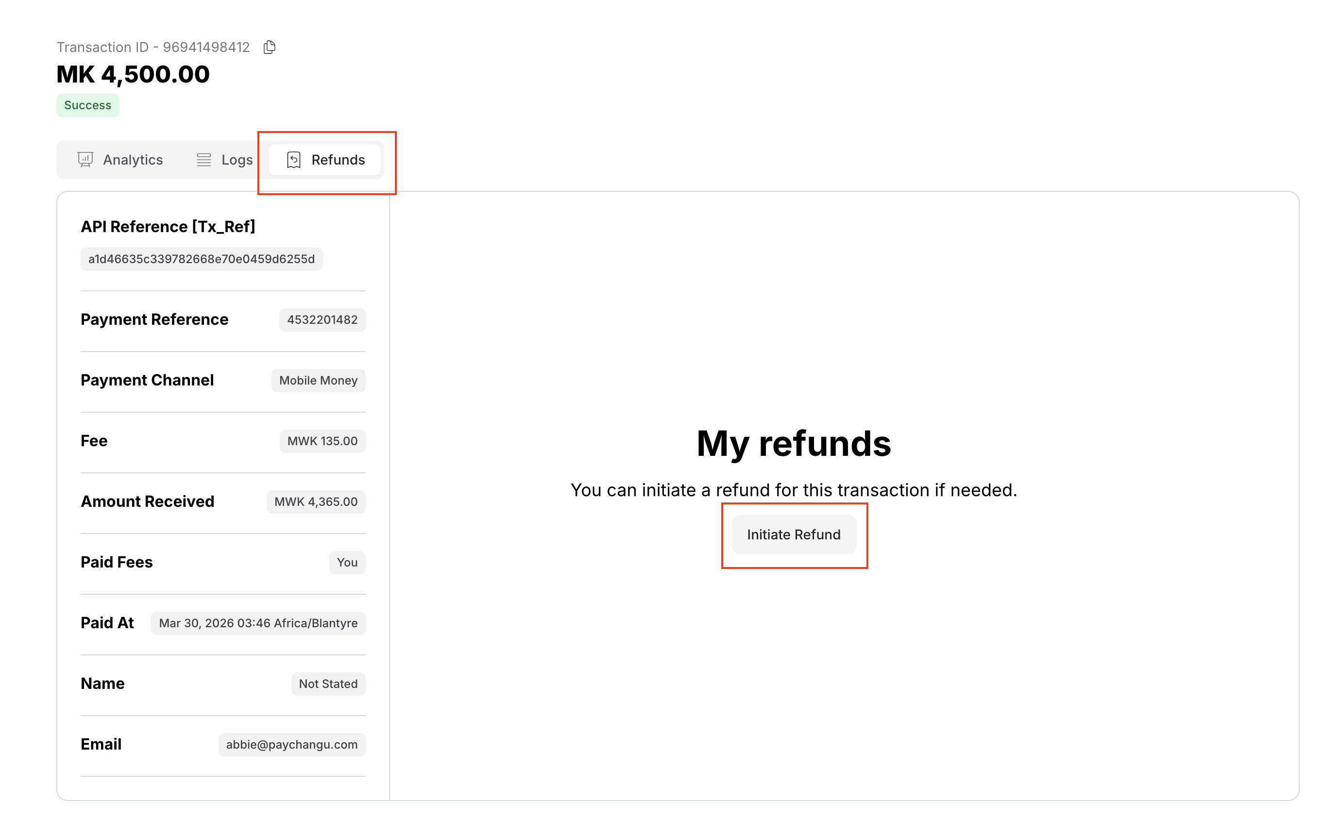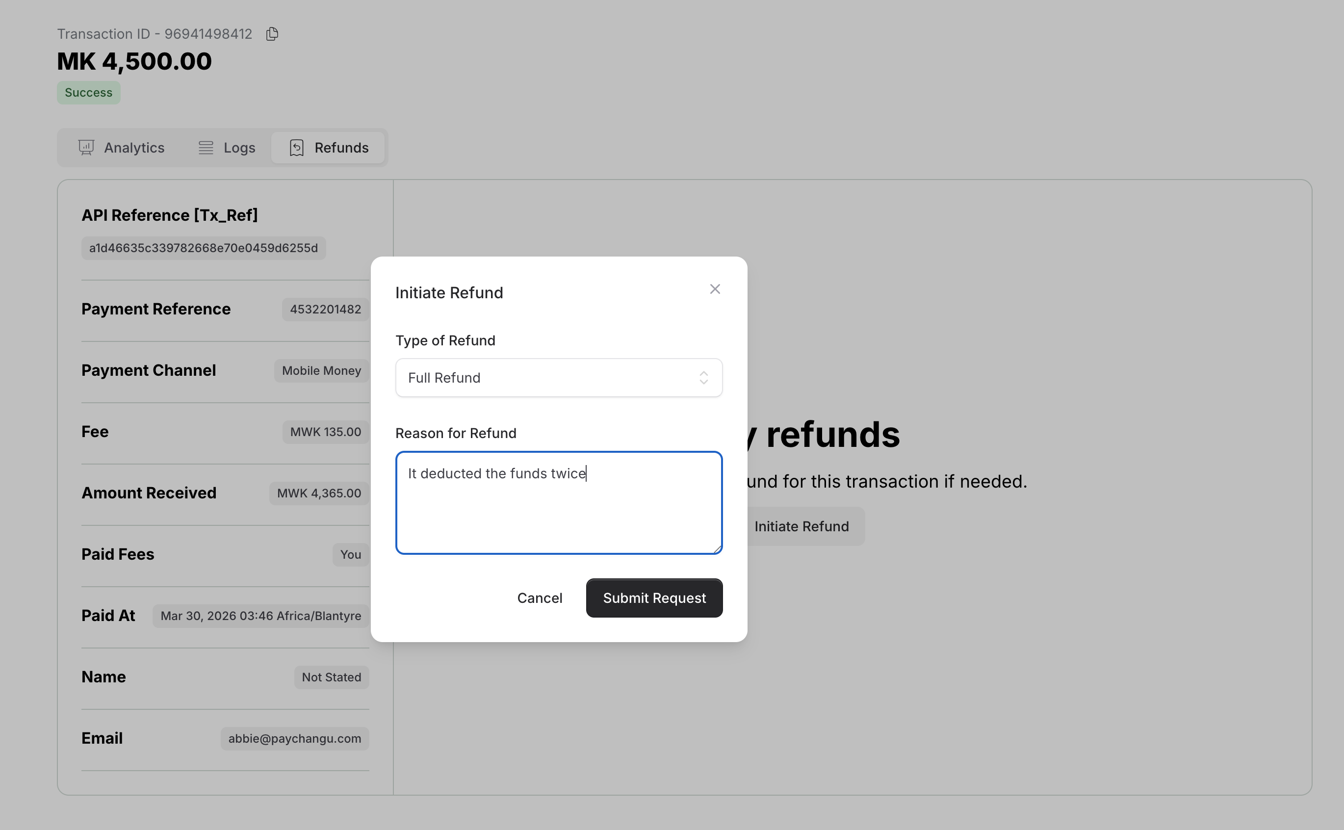 PayChangu makes it simple to issue refunds for transactions when needed. Whether it’s a duplicate payment, a cancelled order, or a customer request, you can initiate refunds quickly and track them in your dashboard.